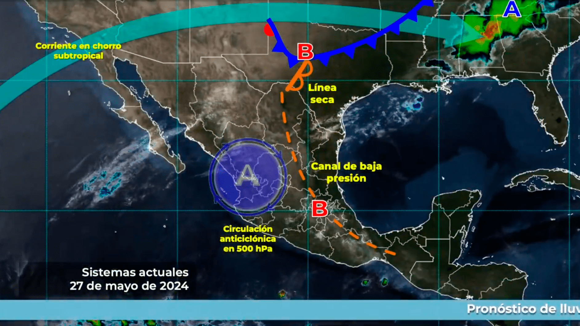 El sistema frontal 23, que se extenderá con características de estacionario desde el norte de la península de Yucatán hasta el sur del golfo de México, el ingreso de humedad procedente del golfo de México y océano Pacífico y la corriente en chorro subtropical, son los sistemas meteorológicos que propiciarán las precipitaciones.
