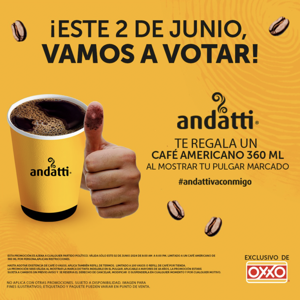 OXXO. Ofrecerá un café americano Andatti de tamaño mediano completamente gratis, la oferta estará disponible hasta las 6:00 de la tarde, y será válida para todas las personas que demuestren haber votado, presentando únicamente su dedo marcado con tinta electoral.