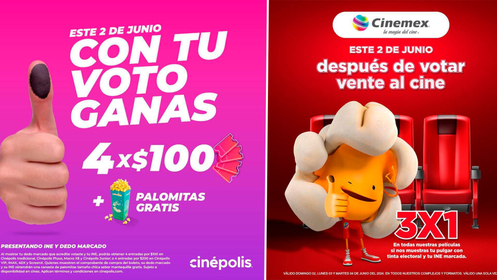 En Cinemex podrás obtener tres entradas al precio de 1 en todas las películas . Debes presentar tu pulgar entintado y tu INE.