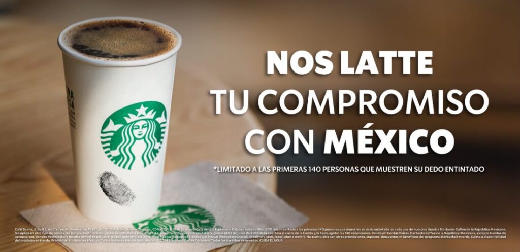 Starbucks México invita a las y los votantes a disfrutar de un café del día tamaño Alto de cortesía al visitar las más de 800 tiendas en el país, al mostrar su dedo marcado con tinta como prueba de votación. Esta oferta es válida únicamente este próximo 2 de junio, y no aplica en las tiendas ubicadas en aeropuertos, universidades y Starbucks Reserve Bar. Hay que tomar en cuenta que en este establecimiento hay un limite de 140 personas por sucursal.
