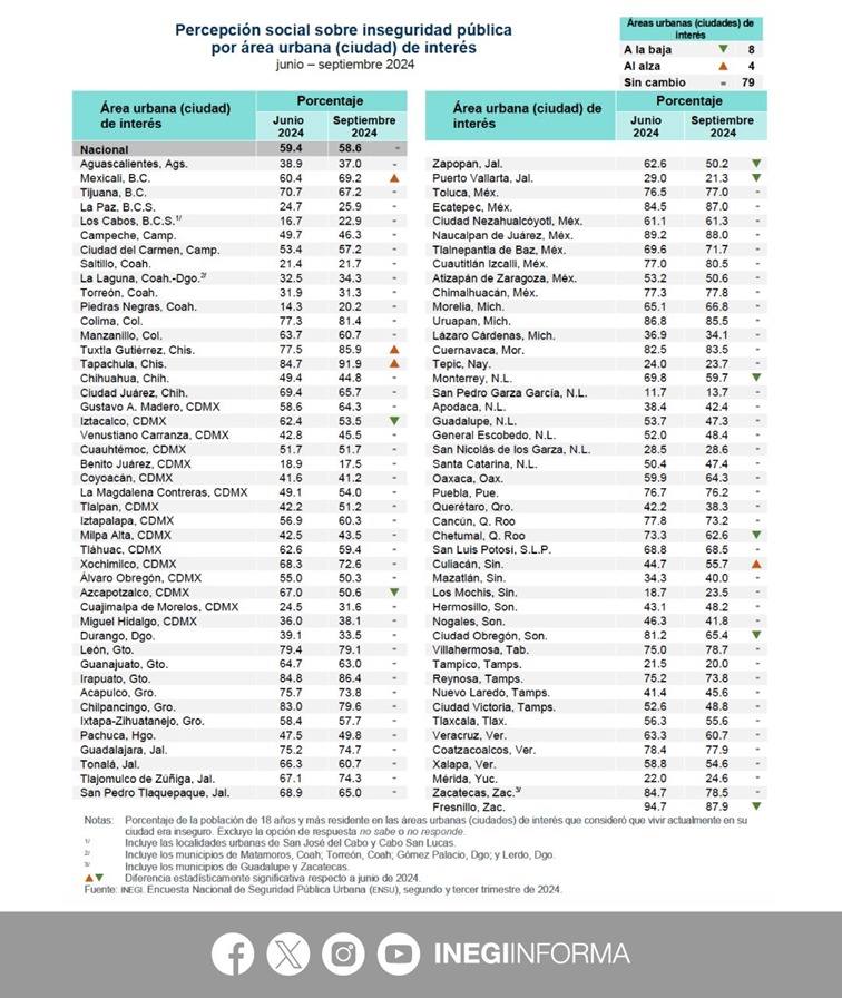 El Instituto Nacional de Estadística y Geografía (INEGI) publicó los resultados de la Encuesta Nacional de Seguridad Pública Urbana (ENSU) correspondientes al tercer trimestre de 2024. Esta encuesta mide la percepción de inseguridad en 91 áreas urbanas de México y ofrece información clave para la toma de decisiones en materia de política pública de seguridad. En septiembre de 2024, el 58.6 % de la población de 18 años y más consideró inseguro vivir en su ciudad. Esta cifra muestra una ligera mejoría respecto al mismo mes del año pasado (61.4 %), pero no es estadísticamente significativa en comparación con junio de 2024 (59.4 %).