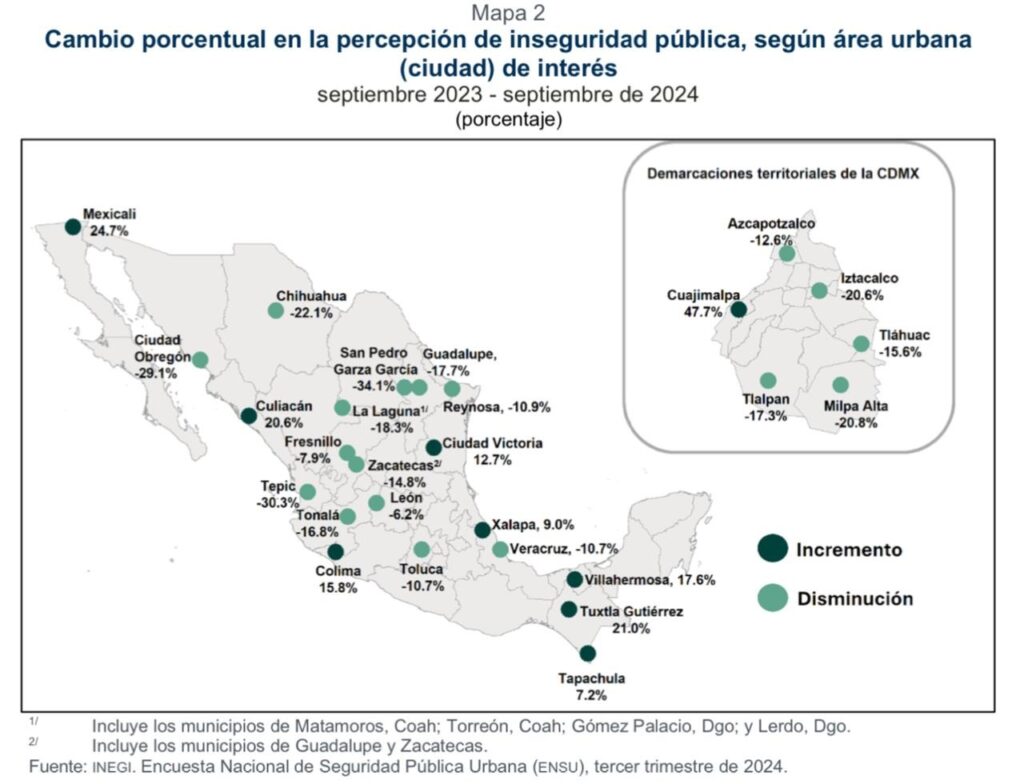 Las ciudades con mayor percepción de inseguridad en septiembre de 2024 fueron Tapachula (91.9 %), Naucalpan de Juárez (88.0 %), Fresnillo (87.9 %), Ecatepec de Morelos (87.0 %), Irapuato (86.4 %) y Tuxtla Gutiérrez (85.9 %). En contraste, las ciudades con menores porcentajes de percepción de inseguridad fueron San Pedro Garza García (13.7 %), Benito Juárez (17.5 %), Tampico (20.0 %), Piedras Negras (20.2 %), Puerto Vallarta (21.3 %) y Saltillo (21.7 %). Además, se observó que las mujeres (64.0 %) se sienten más inseguras que los hombres (52.2 %) en las áreas urbanas encuestadas.