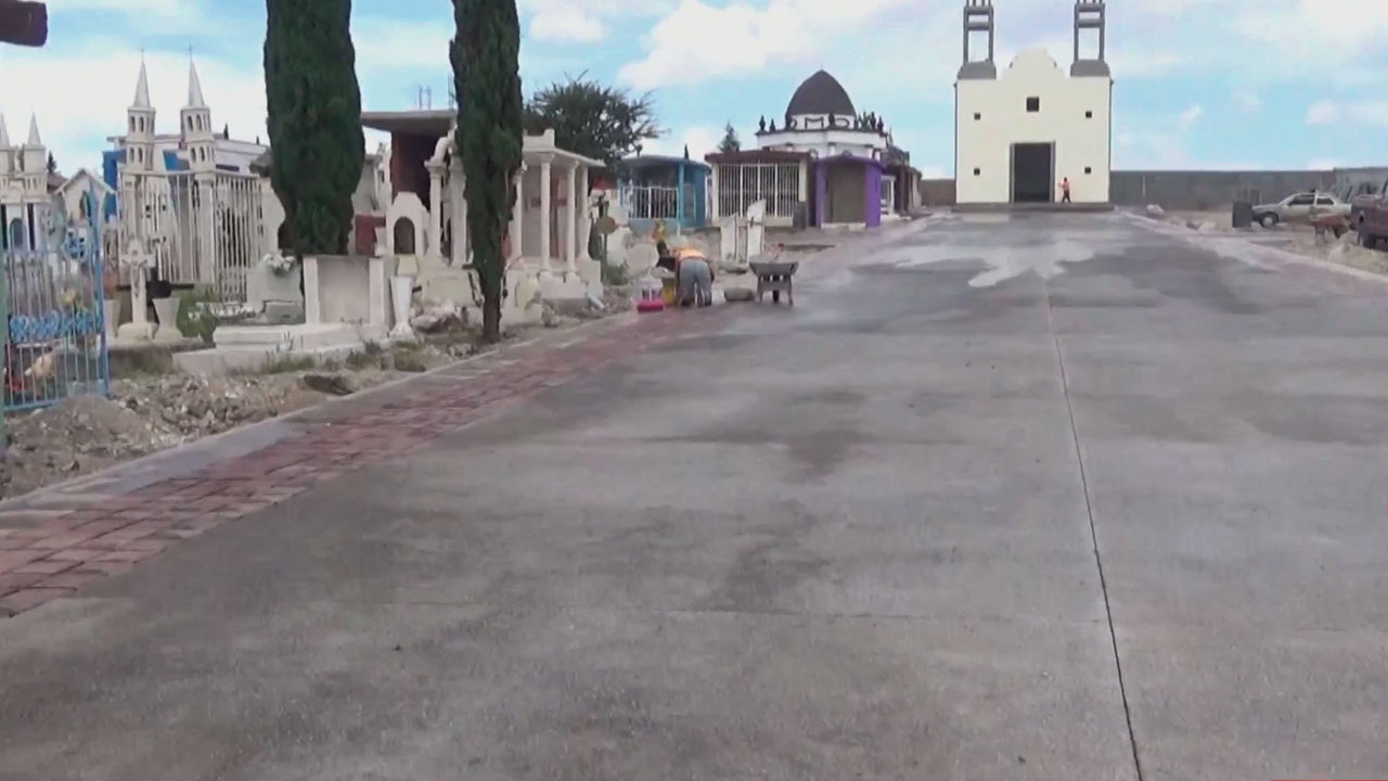 Plateros, Fresnillo.- Ayer, durante una visita al Panteón de Plateros, cámaras de B15 Noticias captaron los trabajos de limpieza y remodelación que se están llevando a cabo en la fachada. Como parte de esta primera etapa, se está construyendo una zona de descanso, con el objetivo de mejorar el espacio antes del 2 de noviembre, cuando se espera la visita de familiares para el Día de Muertos.