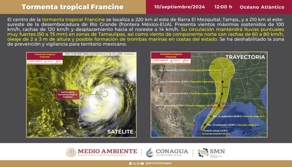 Durante las próximas horas, Francine propiciará lluvias puntuales muy fuertes (de 50 a 75 milímetros [mm]) en regiones de Tamaulipas, y rachas de viento de 60 a 80 km/h, oleaje de 1 a 3 metros de altura y condiciones para la formación de trombas marinas en el litoral de la entidad.
