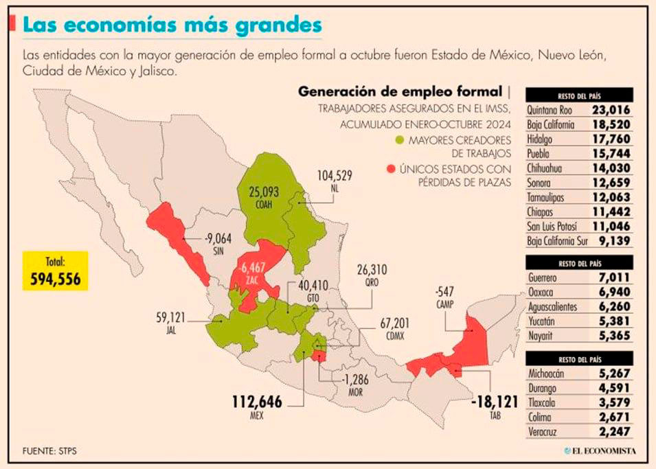 Durante los primeros diez meses de 2024, el Estado de México lideró la generación de empleo formal en el país, sumando 112,646 nuevos puestos registrados en el IMSS, lo que representó el 18.9% del total nacional. Le siguieron Nuevo León con 104,529 empleos, la Ciudad de México con 67,201, Jalisco, y Guanajuato. En contraste, cinco entidades registraron pérdidas de empleos formales: Campeche, Morelos, Zacatecas, Sinaloa y Tabasco.