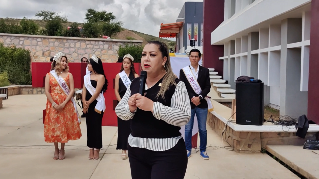 Karina Pérez, durante su mensaje, reconoció la trayectoria de la institución a través de sus directores y destacó las oportunidades que hoy en día disfrutan los alumnos del plantel. También subrayó el apoyo de docentes, padres e instancias que han contribuido a la construcción del alma mater del municipio.
