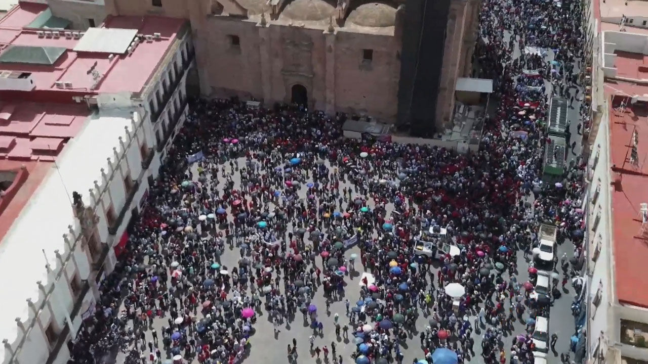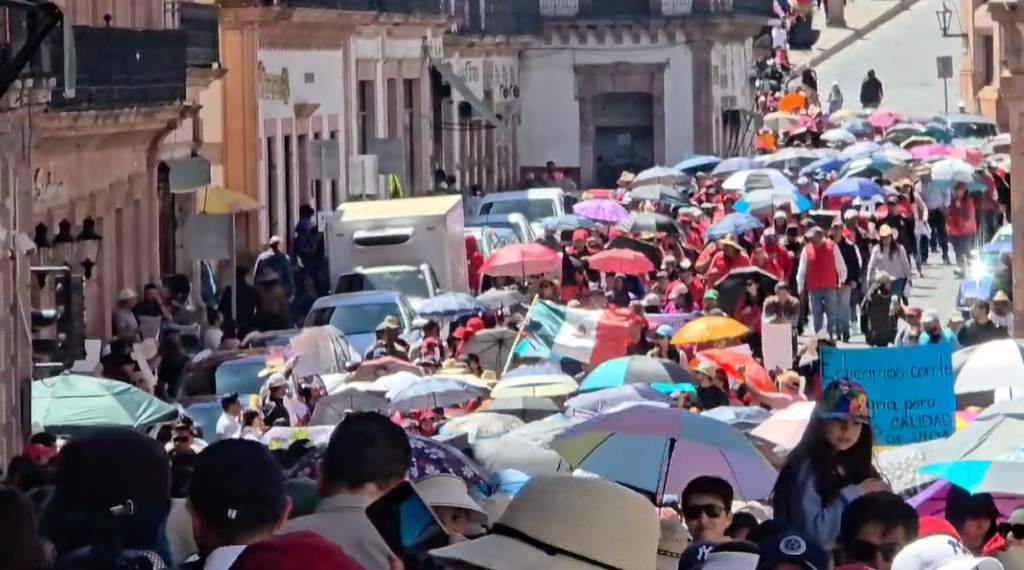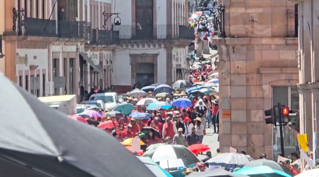 Además de los maestros de Zacatecas, se han unido contingentes de otras entidades, como Fresnillo, Jerez, Pinos, y municipios de estados como Michoacán, Aguascalientes y Colima, lo que refuerza la magnitud de la movilización.